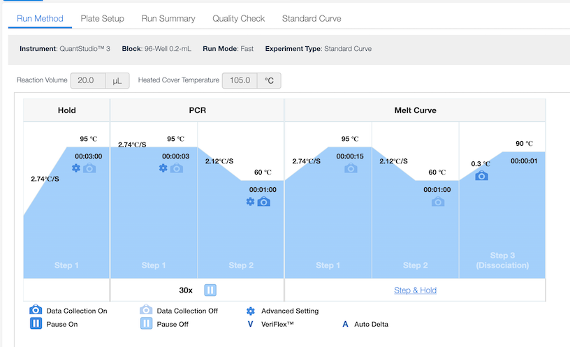The typical settings for Applied Biosystems QuantStudio instruments are shown below. For other instruments, please contact technical support at support@accumol.com.